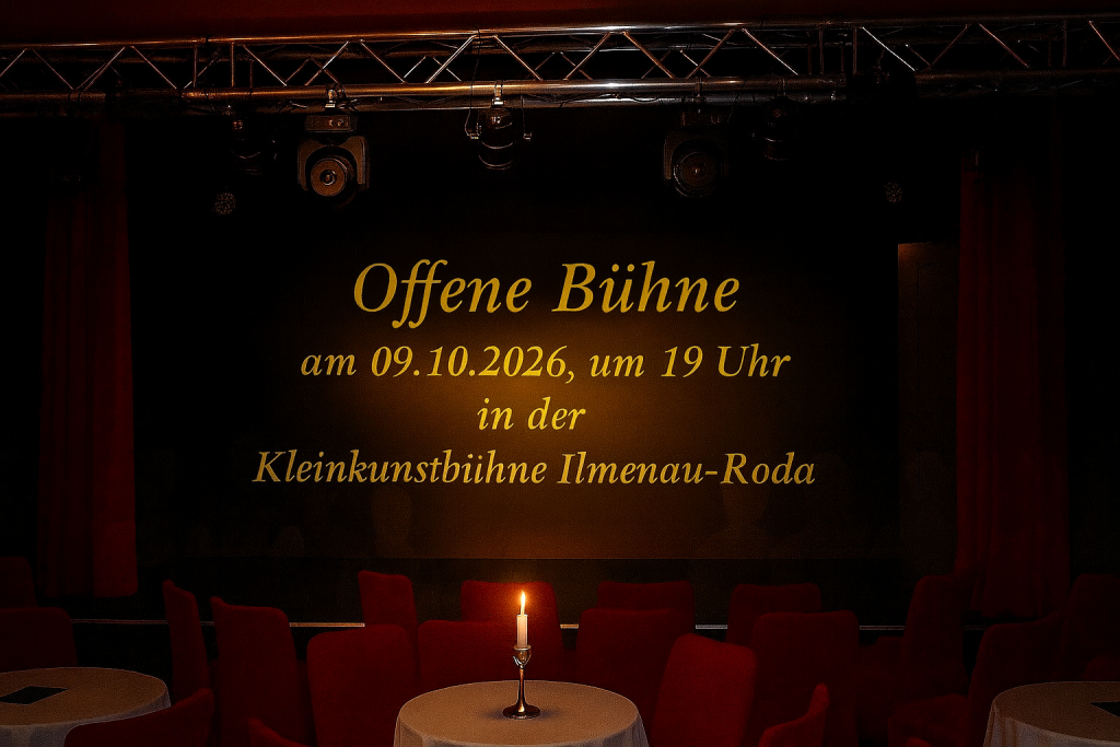 Wenn Ihr etwas vorführen möchtet, dann würden wir Euch bitten die Darbietung bis zum 02. Oktober per Mail bei uns anzukündigen: kuenstler@kleinkunstbuehne-ilmenau-roda.da.